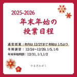 - 年末年始の授業予定【通 常 授 業】 年内は 12月27日まで / 年始は 1月5日より (12月2… 続きを読む: 年末年始の授業予定
