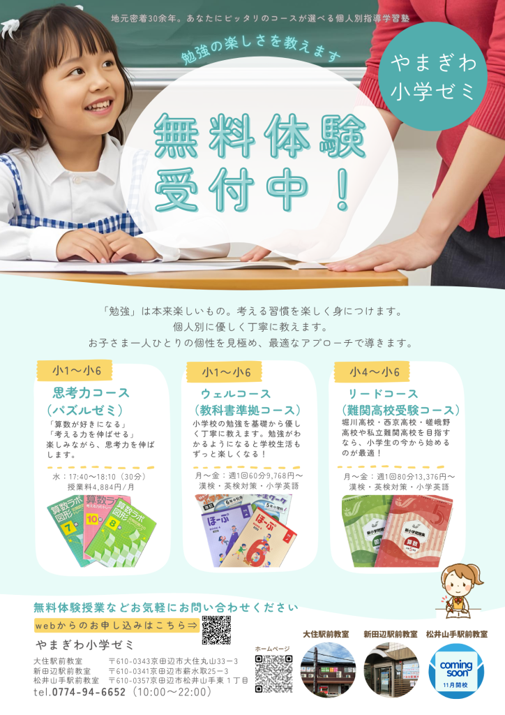 京田辺市のやまぎわ塾といえば、やまぎわゼミ!☆一人ひとりの個性を見極め、最適なアプローチで導きます!☆「学ぶ楽しさ」を教えます!無料体験...