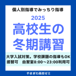 冬期講習2025 申込受付中!やまぎわゼミ冬期講習2025のご案内●苦手分野、伸ばしたい科目を集中的に勉強しましょう!●個人別指導でみっちり指導します!大学入試対...