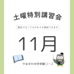 - 【中学受験】11月 土曜講習会のご案内11月土曜講習会のご案内 ◎中学受験をめざす小学生のための土曜講習会 ◎中学受験専門担当教師による個人別指導◎… 続きを読む: 【中学受験】11月 土曜講習会のご案内