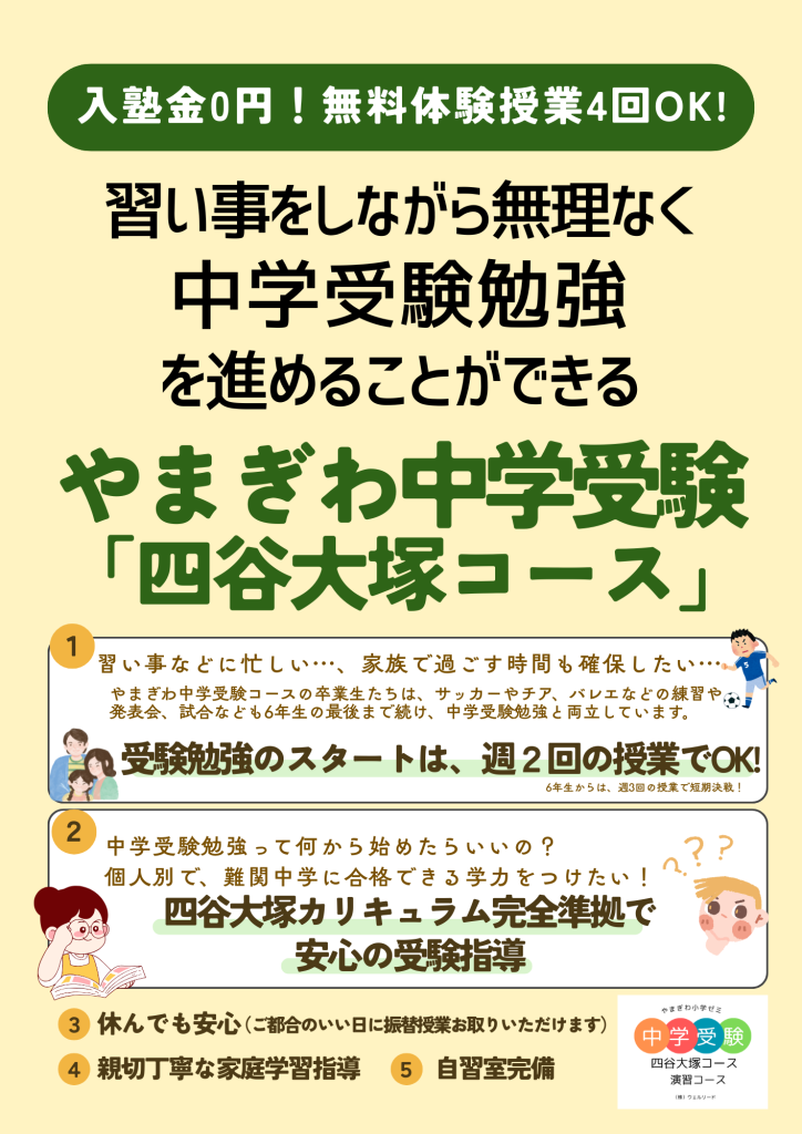 やまぎわ中学受験コースは四谷大塚NET加盟塾です。毎月中学受験コース通信を発行し、今月の学習予定や大事な学習ポイント、最新の進学情報をお届けしています。中学受験コースにつ...