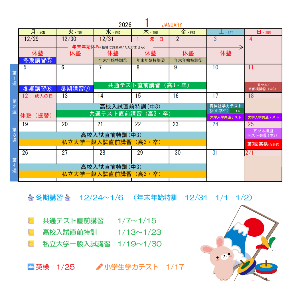 週テスト&組分けテスト会(中学受験コース) 1/10 1/17 1/24