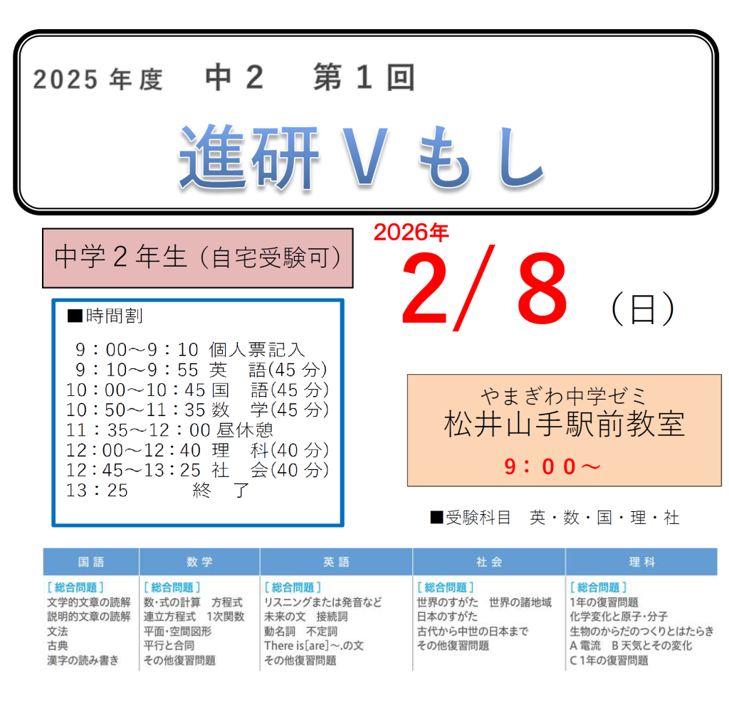 案内書はこちら⇒2月実施 中2進研V模試案内書