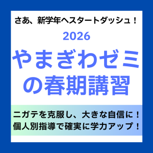夏期講習2025 申込受付中! やまぎわゼミ夏期講習2025のご案内 ●苦手分野、伸ばしたい科目を集中的に勉強しましょう!●個人別指導でみっちり指導します!●偏差値20アップを目指します!大学入試対策・高校入試対策・中学 […]
