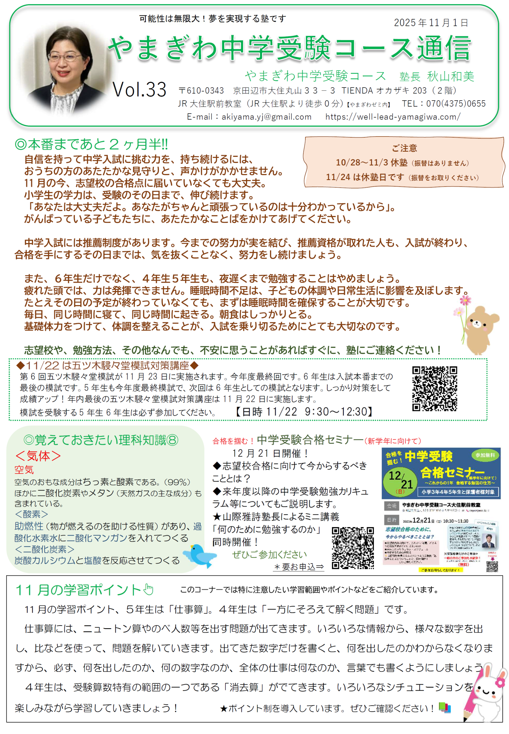 【中学受験】やまぎわ中学受験コース通信vol.33