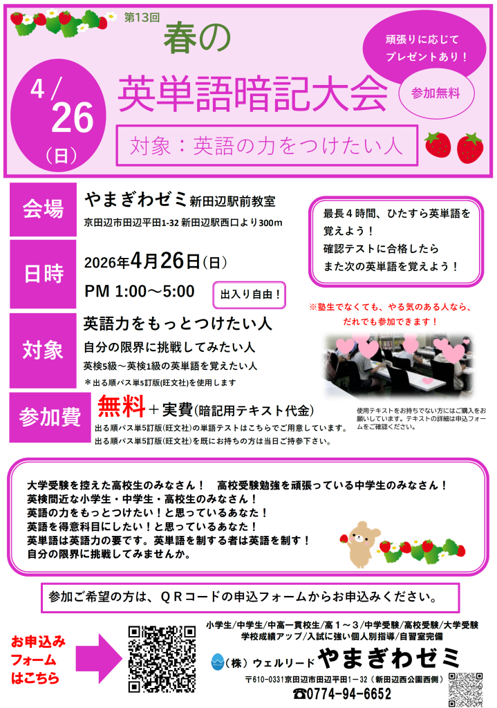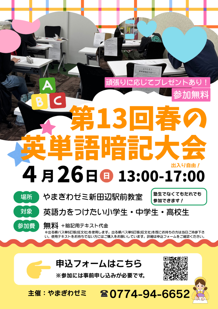 毎回大好評の英単語暗記大会がこの春にも開催されます!!!