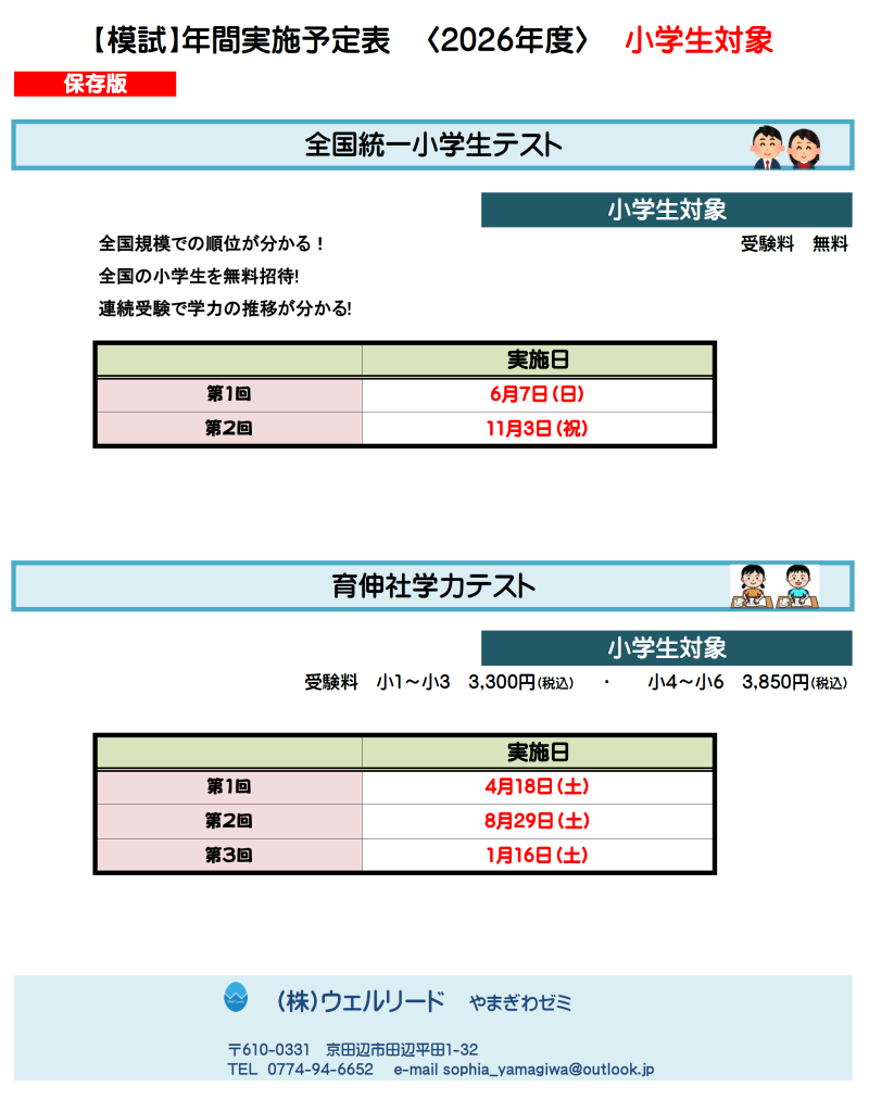 2026年度 小学生の【模試】年間実施予定をお知らせします。