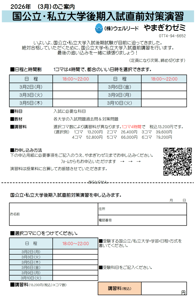 国公立大学・私立大学後期入試直前対策演習案内申込書はこちら