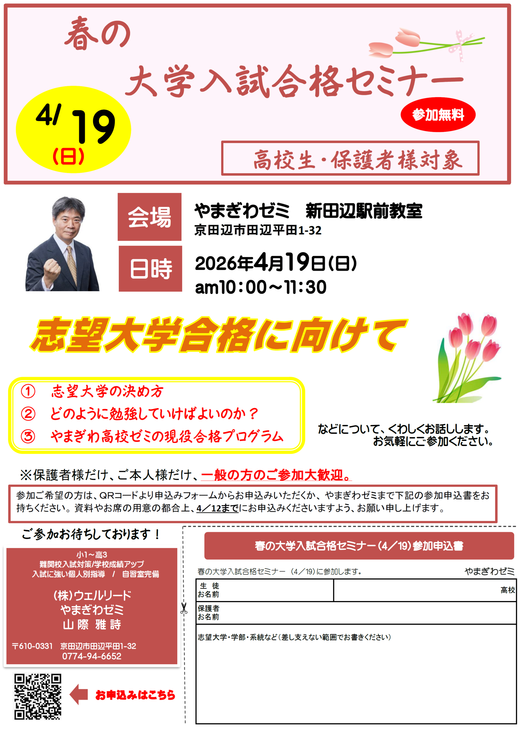 春の大学入試合格セミナーの案内書はこちらから⇒大学入試合格セミナー
