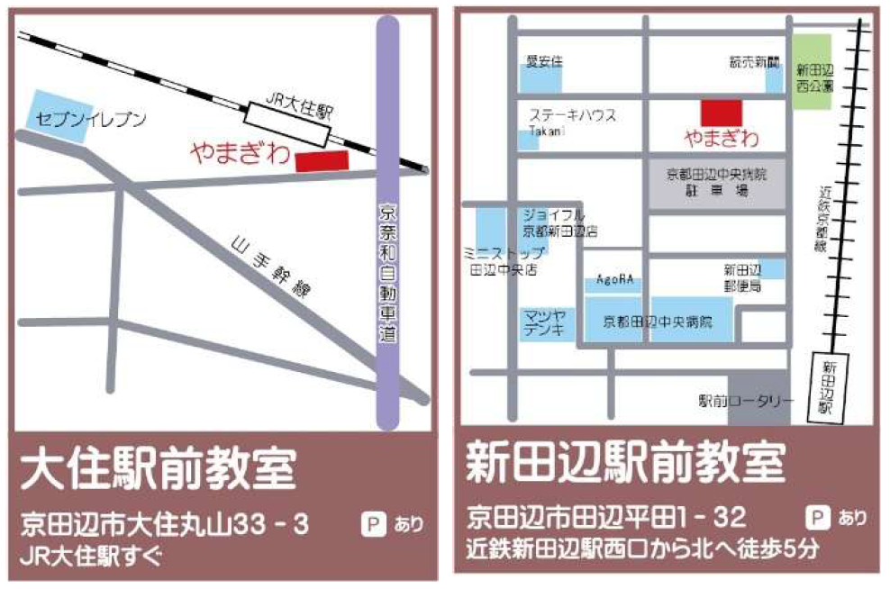 大住駅前教室・新田辺駅前教室のどちらもご利用いただけます