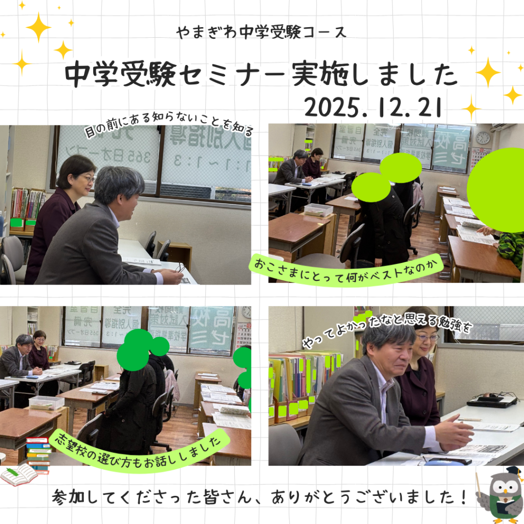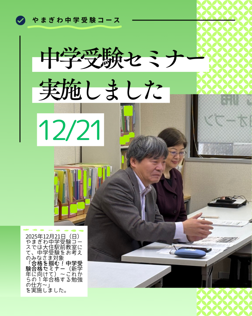 2025年12月21日(日)に、やまぎわ中学受験コース JR大住駅前教室にて、中学受験をお考えのみなさまとその保護者様対象