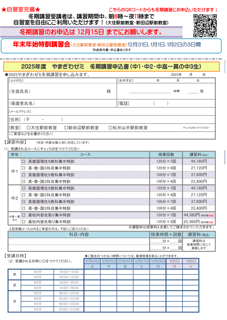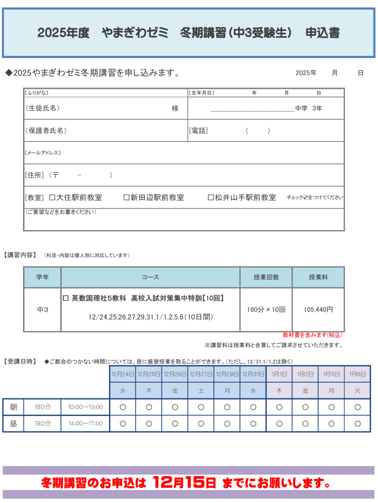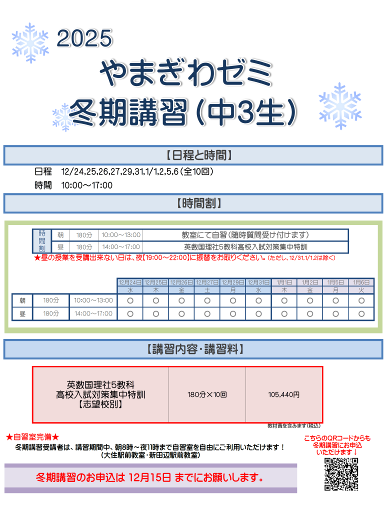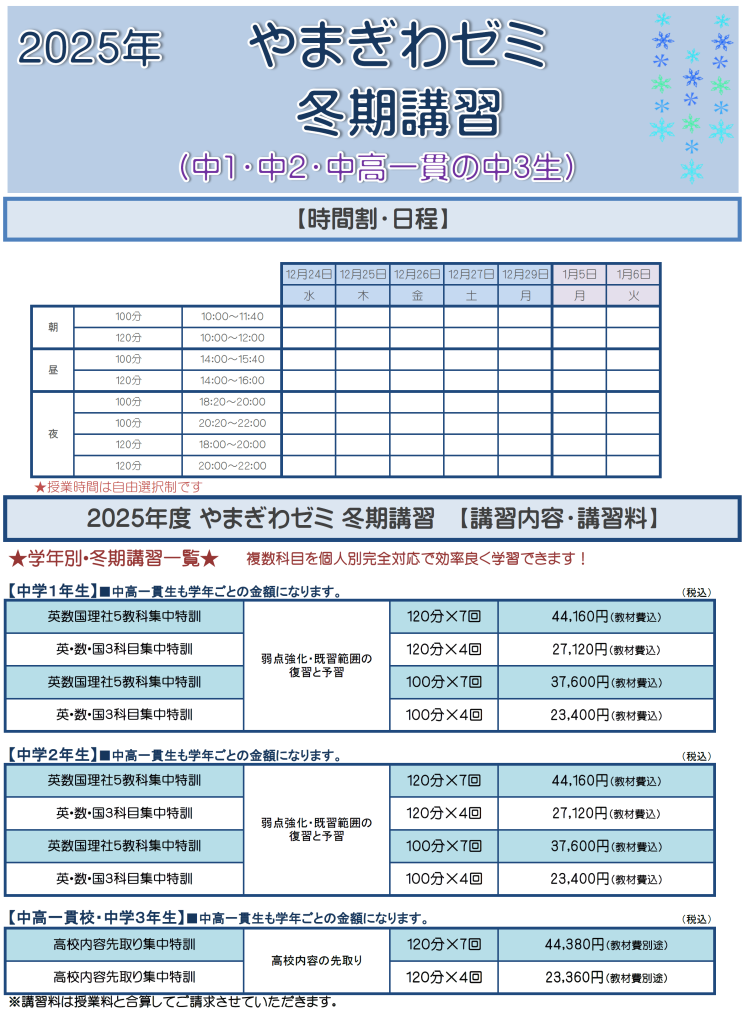 冬期講習:12/24・12/25・12/26・12/27・12/29・1/5・1/6 |