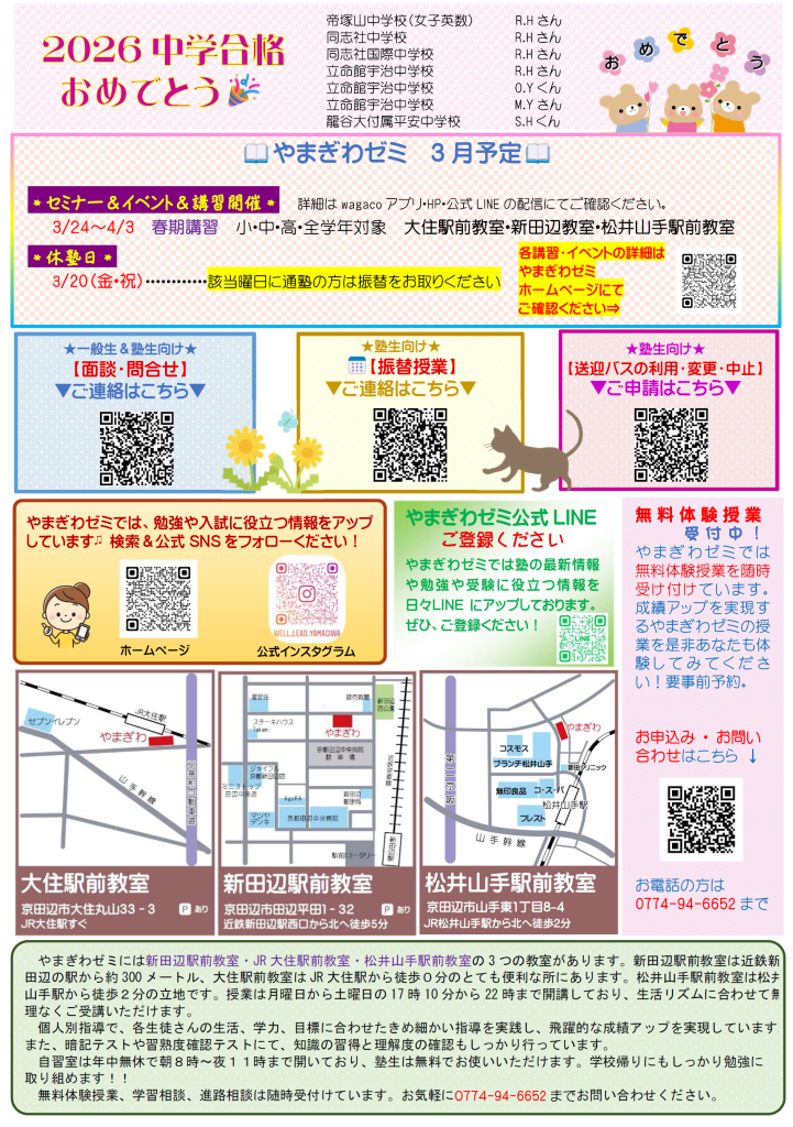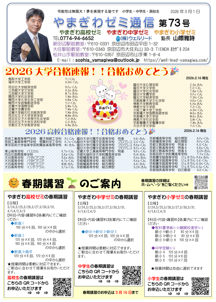 やまぎわゼミ通信 第73号 2026-02-25 最終更新日時 : 2026-02-25 yamagwiazemi やまぎわゼミ通信 第73号 発行しました! やまぎわゼミ通信第73号発行しました。やまぎわゼミでは、毎月ゼミ通信を発行し、最新の進学情報や学習情報をお届けしています。 ⇒ゼミ通信第73号pdf いままでのゼミ通信はこちら⇒ゼミ通信